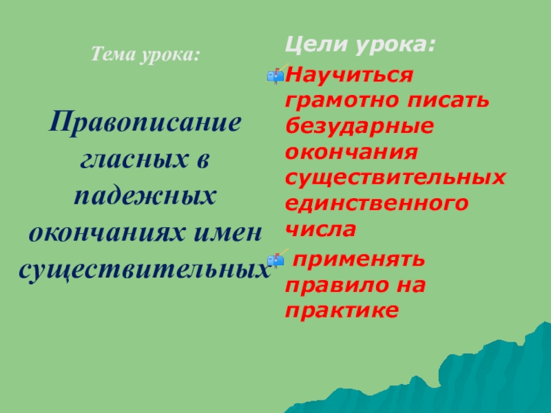 Тема урока:Правописание гласных в падежных окончаниях имен существительныхЦели урока:Научиться грамотно писать безударные окончания существительных единственного числа применять