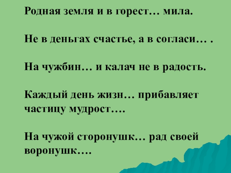 согласи… .   На чужбин… и калач не в радость. Каждый день жизн… прибавляет частицу мудрост…. На чужой сторонушк… рад своей воронушк….