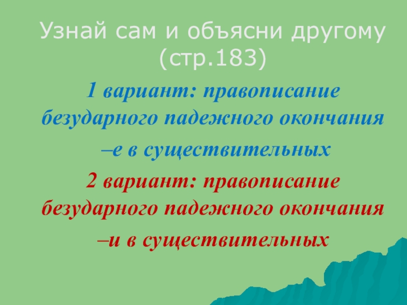 Узнай сам и объясни другому (стр.183)1 вариант: правописание безударного падежного окончания –е в существительных2 вариант: правописание безударного