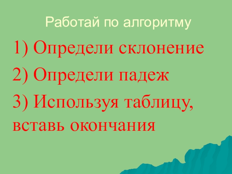 Работай по алгоритму1) Определи склонение2) Определи падеж3) Используя таблицу, вставь окончания