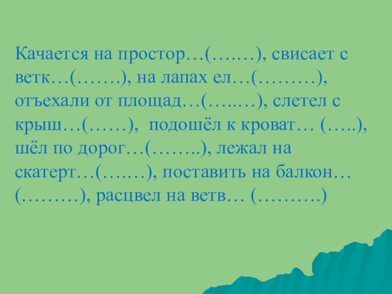 Качается на простор…(….…), свисает с ветк…(…….), на лапах ел…(………), отъехали от площад…(…..…), слетел с крыш…(……), подошёл к