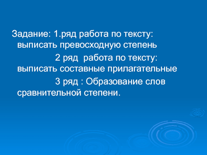 Слайд 10 Задание: 1.ряд работа по тексту: выписать превосходную степень