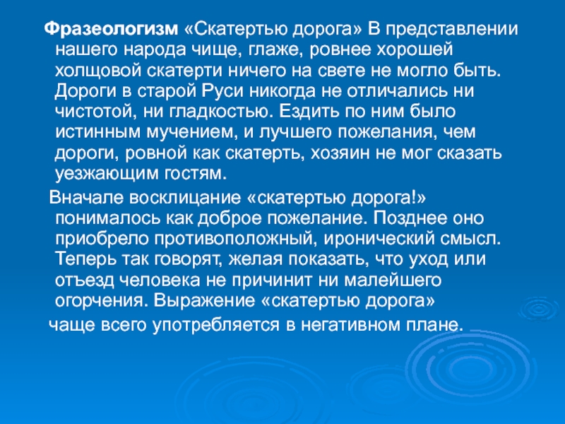 Слайд 4 Фразеологизм «Скатертью дорога» В представлении нашего народа чище, глаже, ровнее