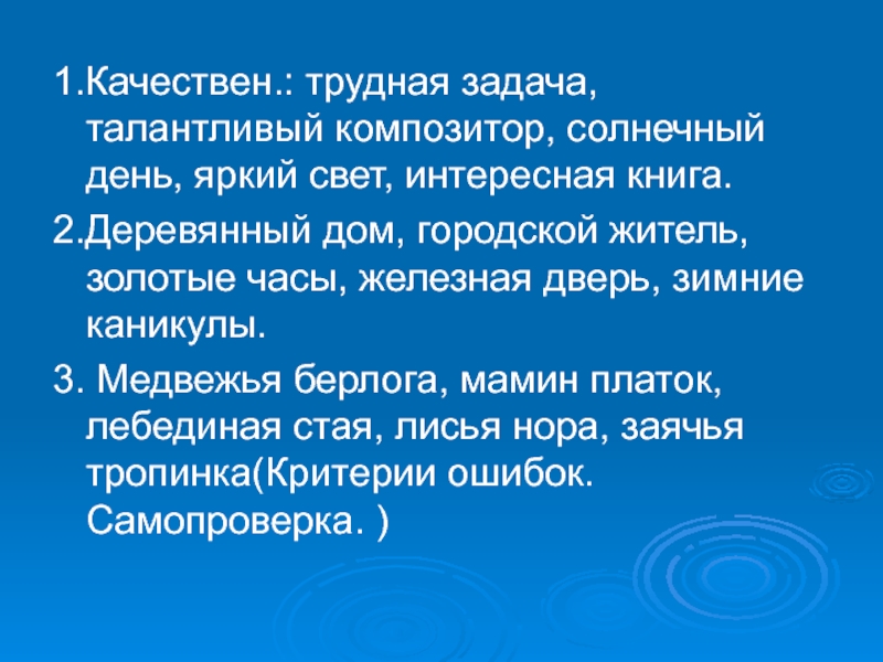 Слайд 91.Качествен.: трудная задача, талантливый композитор, солнечный день, яркий свет, интересная книга.