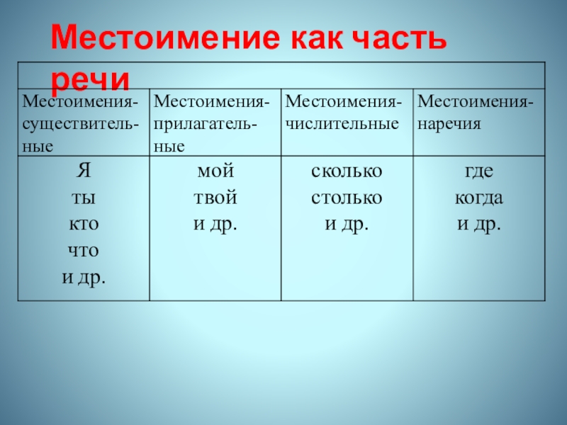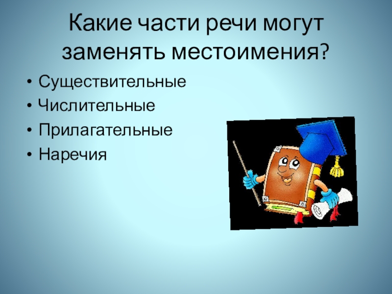 Какие части речи могут заменять местоимения?СуществительныеЧислительныеПрилагательныеНаречия