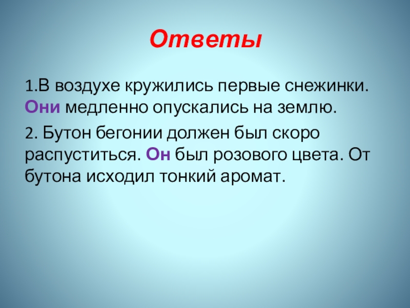 Ответы1.В воздухе кружились первые снежинки. Они медленно опускались на землю.2. Бутон бегонии должен был скоро распуститься. Он