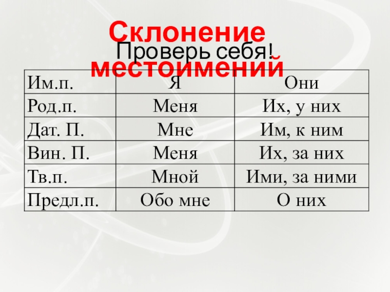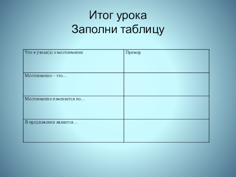 Слайд 13Выпишите местоимения , укажите их лицо, число, падеж и род(если можно)