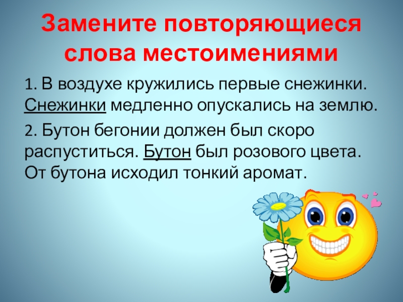 Замените повторяющиеся слова местоимениями1. В воздухе кружились первые снежинки. Снежинки медленно опускались на землю.2. Бутон бегонии должен