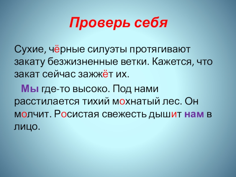 Проверь себяСухие, чёрные силуэты протягивают закату безжизненные ветки. Кажется, что закат сейчас зажжёт их.  Мы где-то