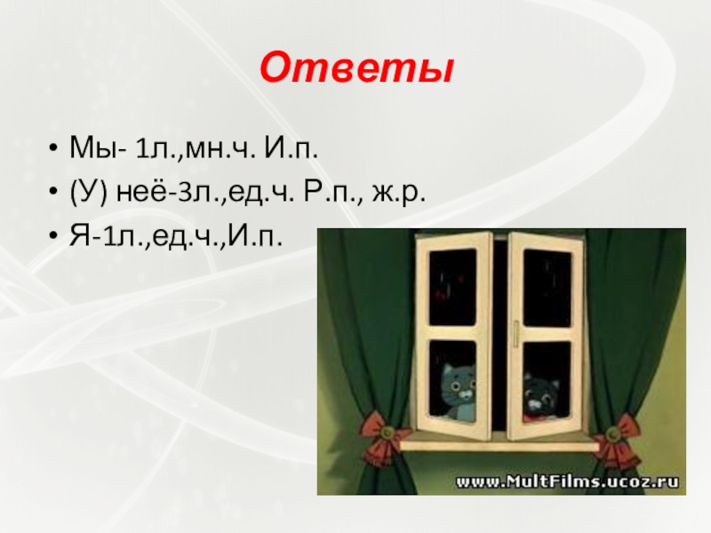 ОтветыМы- 1л.,мн.ч. И.п.(У) неё-3л.,ед.ч. Р.п., ж.р.Я-1л.,ед.ч.,И.п.