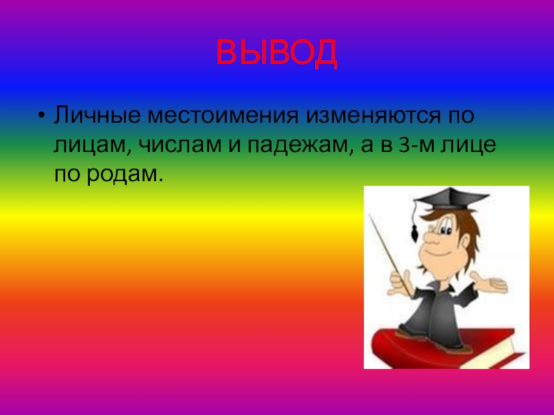 ВЫВОДЛичные местоимения изменяются по лицам, числам и падежам, а в 3-м лице по родам.
