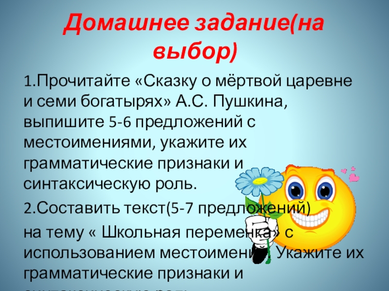 Домашнее задание(на выбор)1.Прочитайте «Сказку о мёртвой царевне и семи богатырях» А.С. Пушкина, выпишите 5-6 предложений с местоимениями,