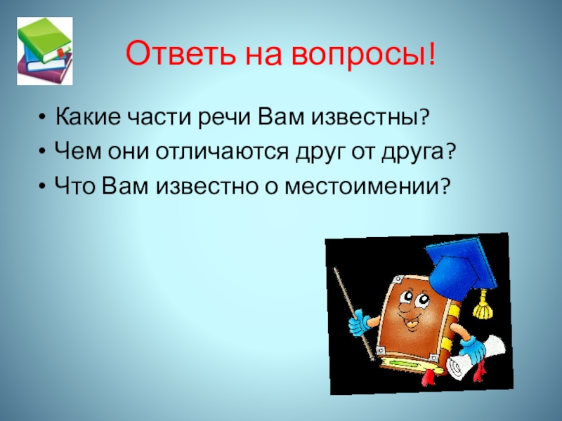 Ответь на вопросы!Какие части речи Вам известны?Чем они отличаются друг от друга?Что Вам известно о местоимении?