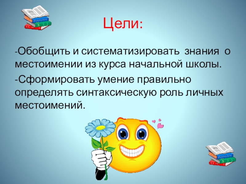 Цели:-Обобщить и систематизировать знания о местоимении из курса начальной школы.-Сформировать умение правильно определять синтаксическую роль личных местоимений.