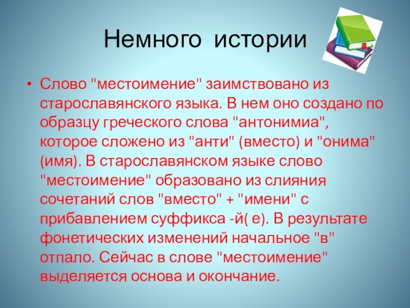 Слово "местоимение" заимствовано из старославянского языка. В нем оно создано
