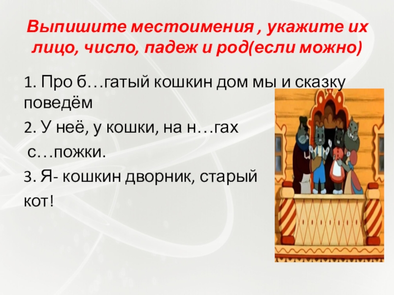 Выпишите местоимения , укажите их лицо, число, падеж и род(если можно)1. Про б…гатый кошкин дом мы и