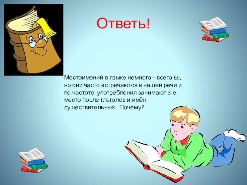 Ответь!Местоимений в языке немного—всего 69, но они часто встречаются в нашей речи и по частоте употребления занимают