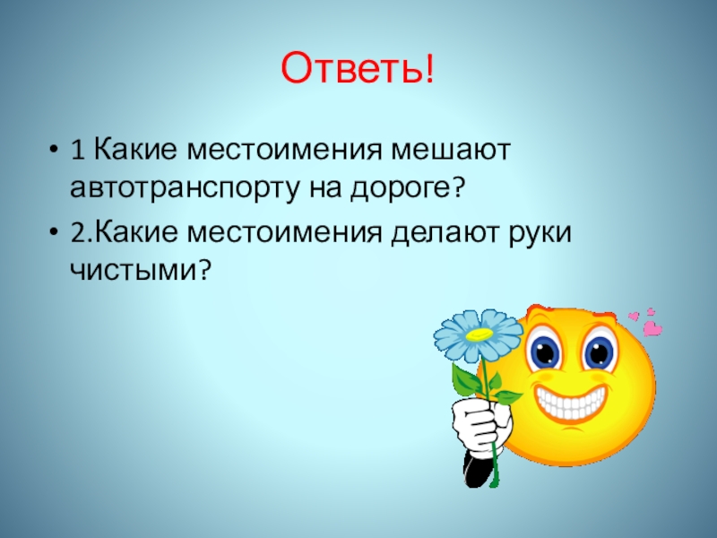 Ответь!1 Какие местоимения мешают автотранспорту на дороге? 2.Какие местоимения делают руки чистыми?