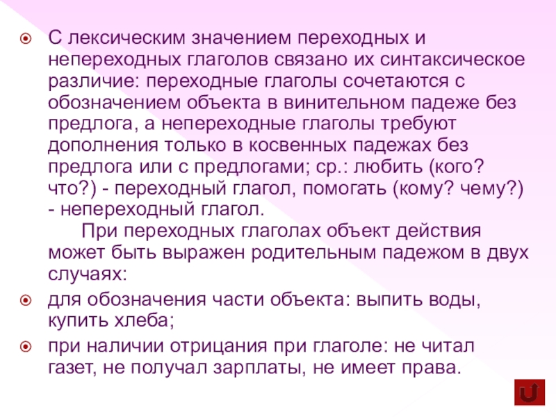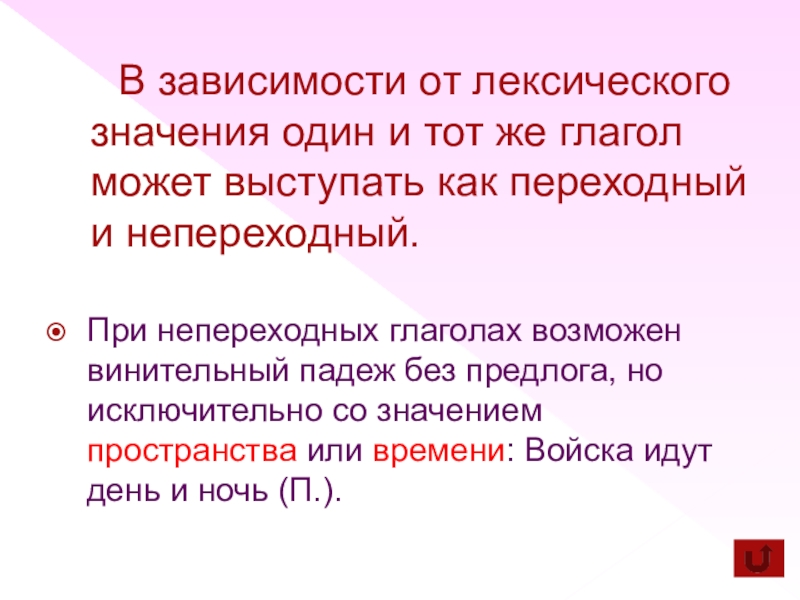 При непереходных глаголах возможен винительный падеж без предлога, но исключительно со значением пространства или времени: Войска идут день и ночь (П.).