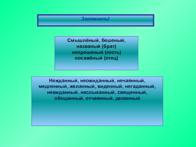 Нежданный, неожиданный, нечаянный, медленный, желанный, виденный, негаданный, невиданный, неслыханный, священный, обещанный, отчаянный, деланный