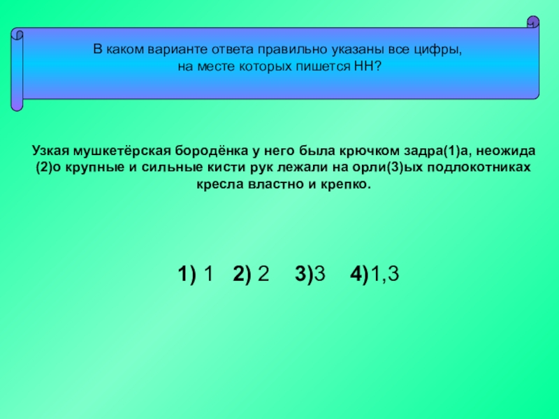 Узкая мушкетёрская бородёнка у него была крючком задра(1)а, неожида(2)о крупные и сильные кисти рук лежали на орли(3)ых подлокотниках кресла властно и крепко.
