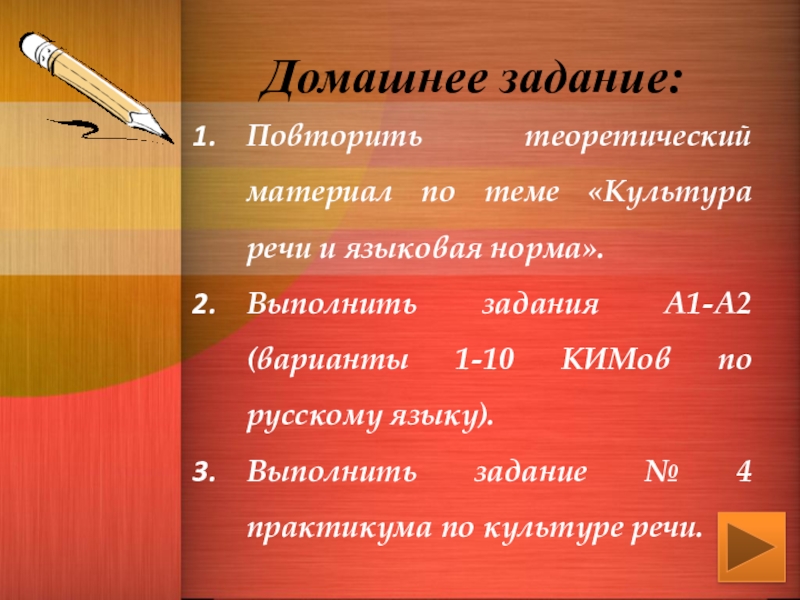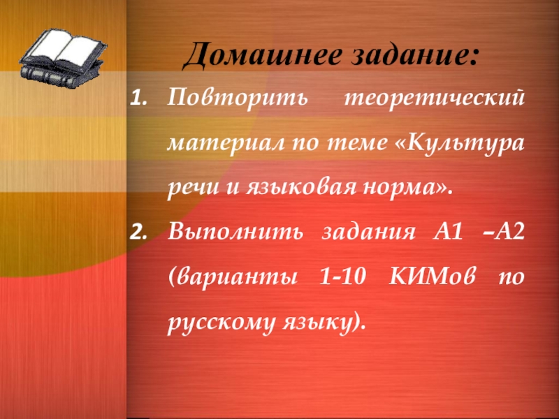 Повторить теоретический материал по теме «Культура речи и языковая норма».