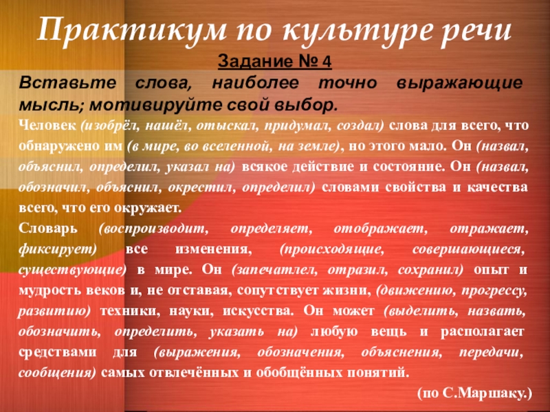Словарь (воспроизводит, определяет, отображает, отражает, фиксирует) все изменения, (происходящие, совершающиеся, существующие) в мире. Он (запечатлел, отразил, сохранил) опыт и мудрость веков и, не отставая, сопутствует жизни, (движению, прогрессу, развитию) техники, науки, искусства. Он может (выделить, назвать, обозначить, определить, указать на) любую вещь и располагает средствами для (выражения, обозначения, объяснения, передачи, сообщения) самых отвлечённых и обобщённых понятий.