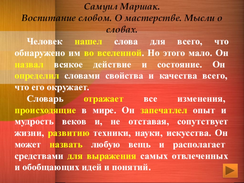 Словарь отражает все изменения, происходящие в мире. Он запечатлел опыт и мудрость веков и, не отставая, сопутствует жизни, развитию техники, науки, искусства. Он может назвать любую вещь и располагает средствами для выражения самых отвлеченных и обобщающих идей и понятий.