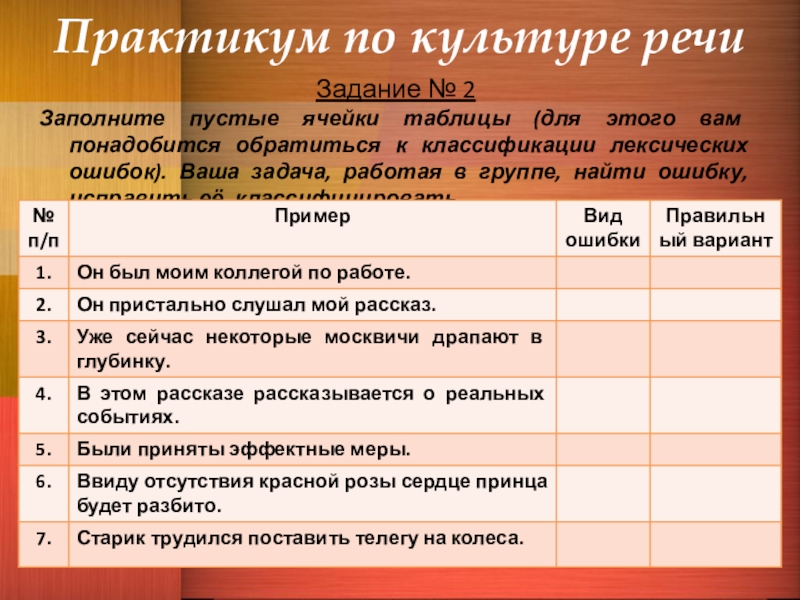 вам понадобится обратиться к классификации лексических ошибок). Ваша задача, работая в группе, найти ошибку, исправить её, классифицировать.