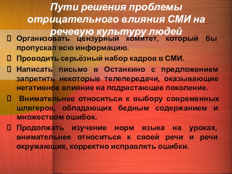 Слайд 12Пути решения проблемы отрицательного влияния СМИ на речевую культуру людей