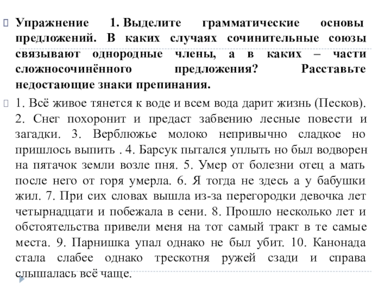 Упражнение 1. Выделите грамматические основы предложений. В каких случаях сочинительные союзы связывают однородные члены, а в каких – части сложносочинённого предложения? Расставьте недостающие знаки препинания.1. Всё живое тянется к воде и всем вода дарит жизнь (Песков). 2.