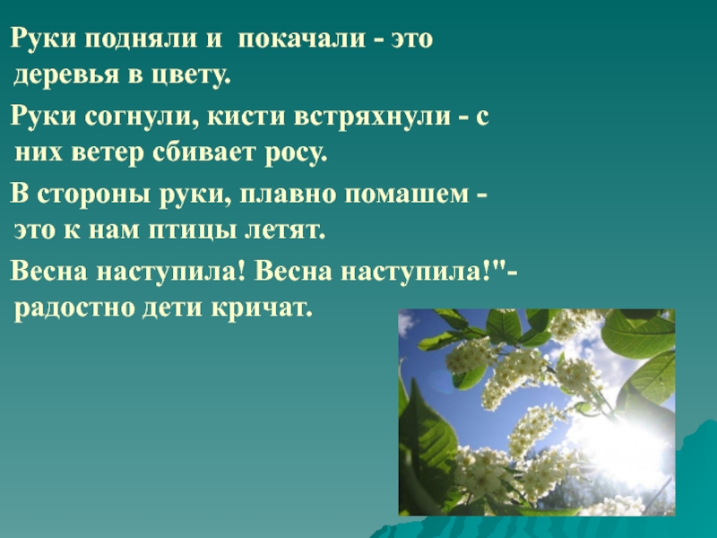 Слайд 10 Руки подняли и покачали - это деревья в цвету.