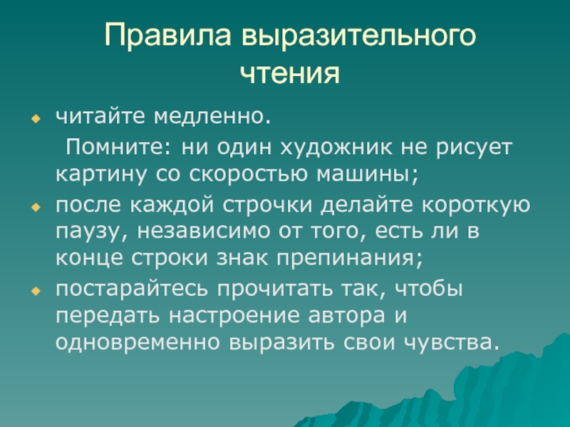 Правила выразительного чтениячитайте медленно.   Помните: ни один художник не рисует картину со скоростью машины;после каждой