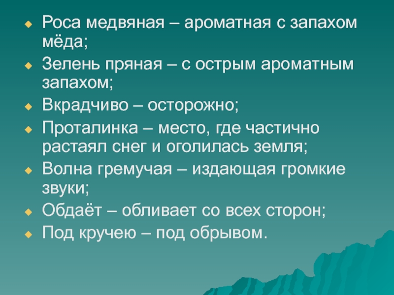 Роса медвяная – ароматная с запахом мёда;Зелень пряная – с острым ароматным запахом;Вкрадчиво – осторожно;Проталинка – место,