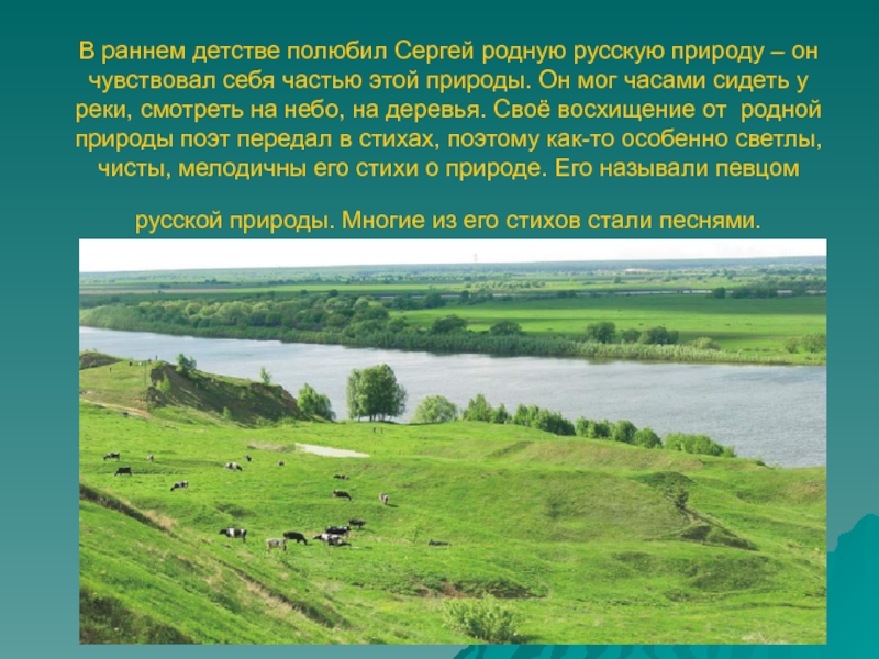 себя частью этой природы. Он мог часами сидеть у реки, смотреть на небо, на деревья. Своё восхищение от родной природы поэт передал в стихах, поэтому как-то особенно светлы, чисты, мелодичны его стихи о природе. Его называли певцом русской природы. Многие из его стихов стали песнями.