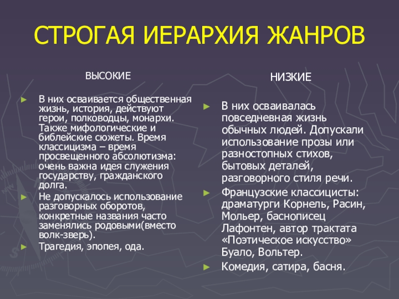 В них осваивалась повседневная жизнь обычных людей. Допускали использование прозы или разностопных стихов, бытовых деталей, разговорного стиля речи.