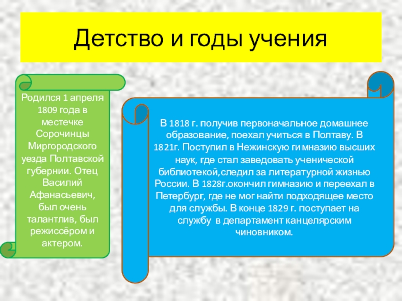 В 1818 г. получив первоначальное домашнее образование, поехал учиться в Полтаву. В 1821г. Поступил в Нежинскую гимназию высших наук, где стал заведовать ученической библиотекой,следил за литературной жизнью России. В 1828г.окончил гимназию и переехал в Петербург, где не мог найти подходящее место для службы. В конце 1829 г. поступает на службу в департамент канцелярским чиновником.