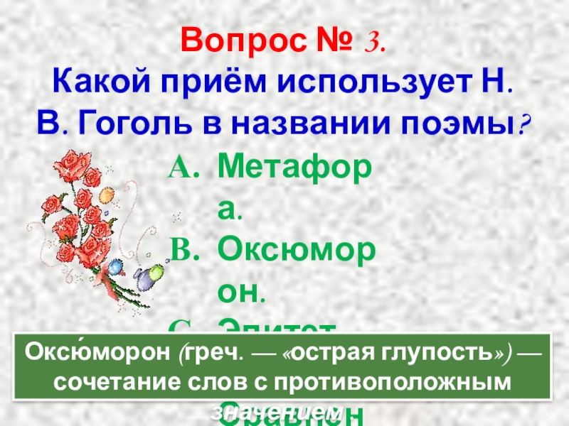 Оксю́морон (греч. — «острая глупость») — сочетание слов с противоположным значением .