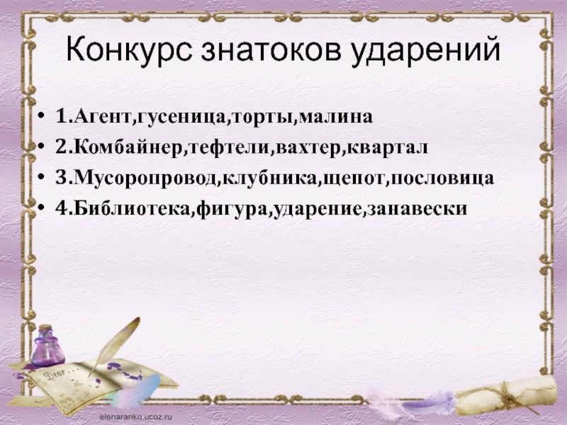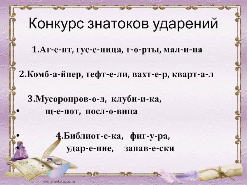 Слайд 5 1.Аг-е-нт, гус-е-ница, т-о-рты, мал-и-на