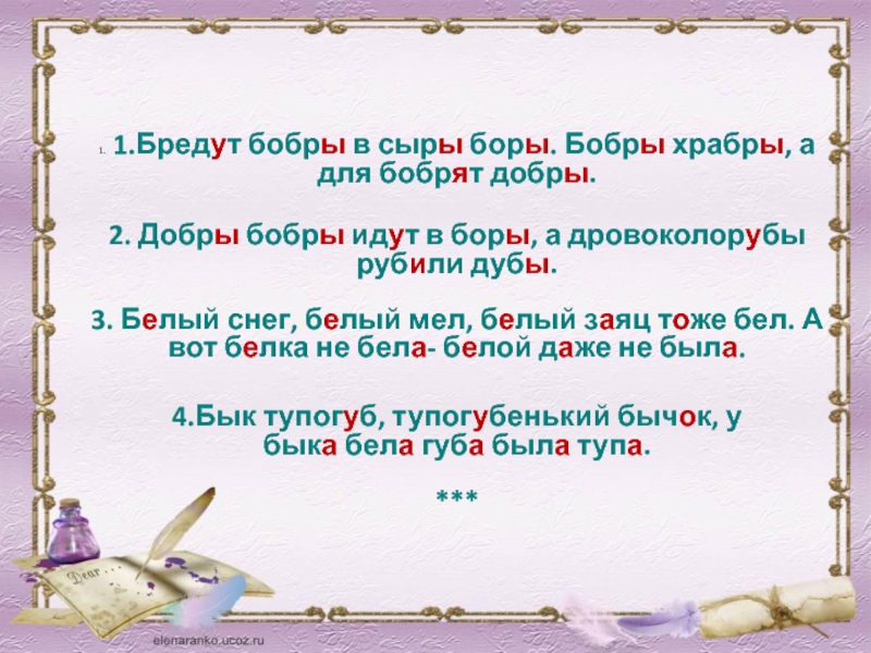 1. 1.Бредут бобры в сыры боры. Бобры храбры, а для бобрят добры.