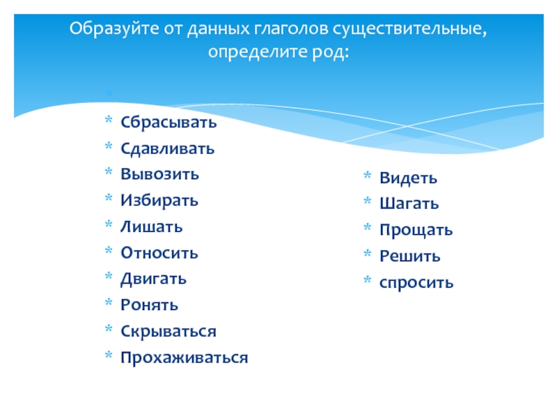Слайд 14Образуйте от данных глаголов существительные, определите род: