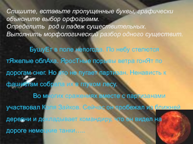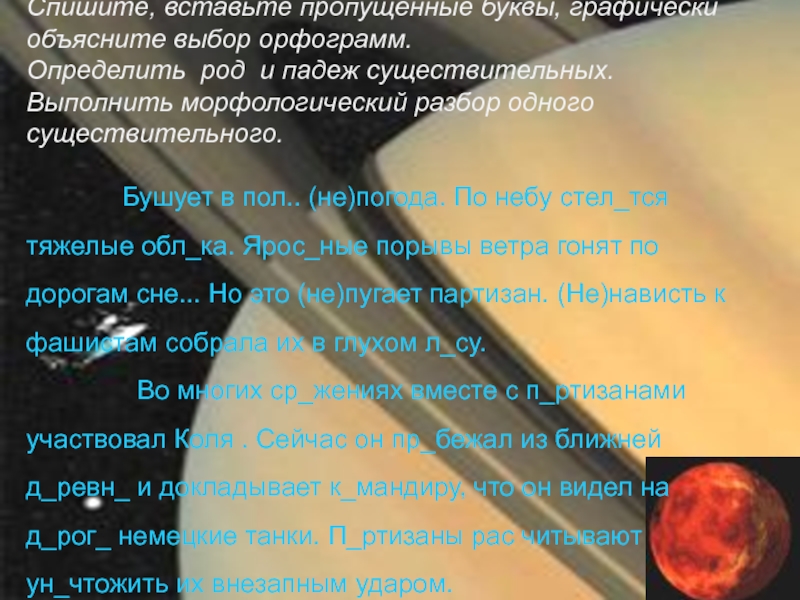 Бушует в пол.. (не)погода. По небу стел_тся тяжелые обл_ка. Ярос_ные порывы ветра гонят по дорогам сне... Но это (не)пугает партизан. (Не)нависть к фашистам собрала их в глухом л_су.