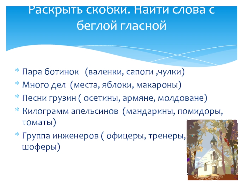 Слайд 16Раскрыть скобки. Найти слова с беглой гласной