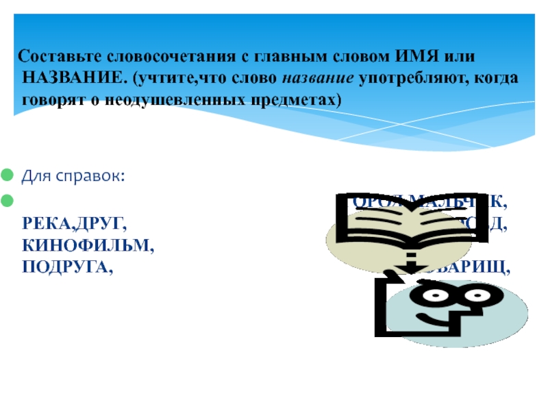 Слайд 28 Составьте словосочетания с главным словом ИМЯ или НАЗВАНИЕ. (учтите,что