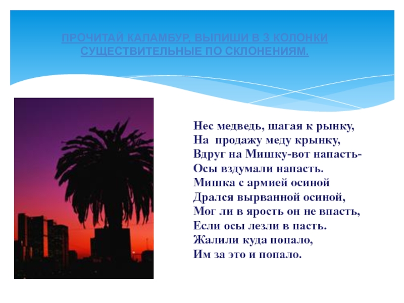 ПРОЧИТАЙ КАЛАМБУР, ВЫПИШИ В З КОЛОНКИ СУЩЕСТВИТЕЛЬНЫЕ ПО СКЛОНЕНИЯМ.