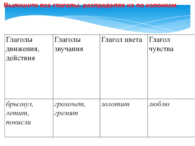 Слайд 12 Выпишите все глаголы, распределяя их по колонкам.