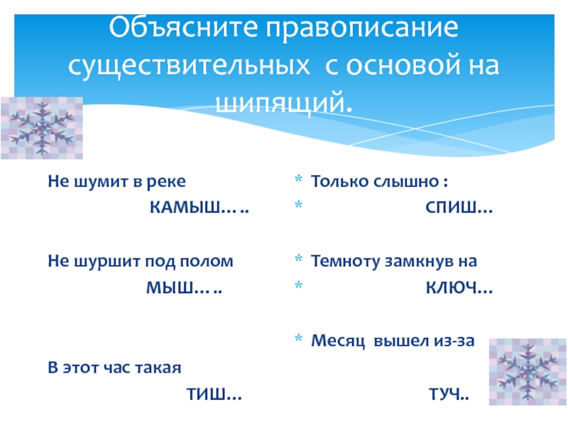 Слайд 15Объясните правописание существительных с основой на шипящий.