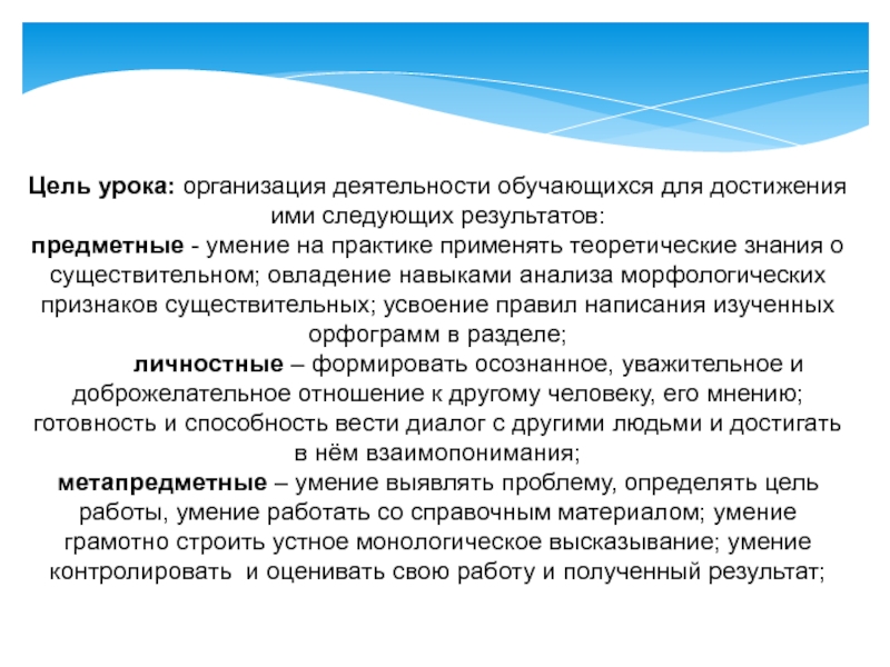 умение на практике применять теоретические знания о существительном; овладение навыками анализа морфологических признаков существительных; усвоение правил написания изученных орфограмм в разделе;