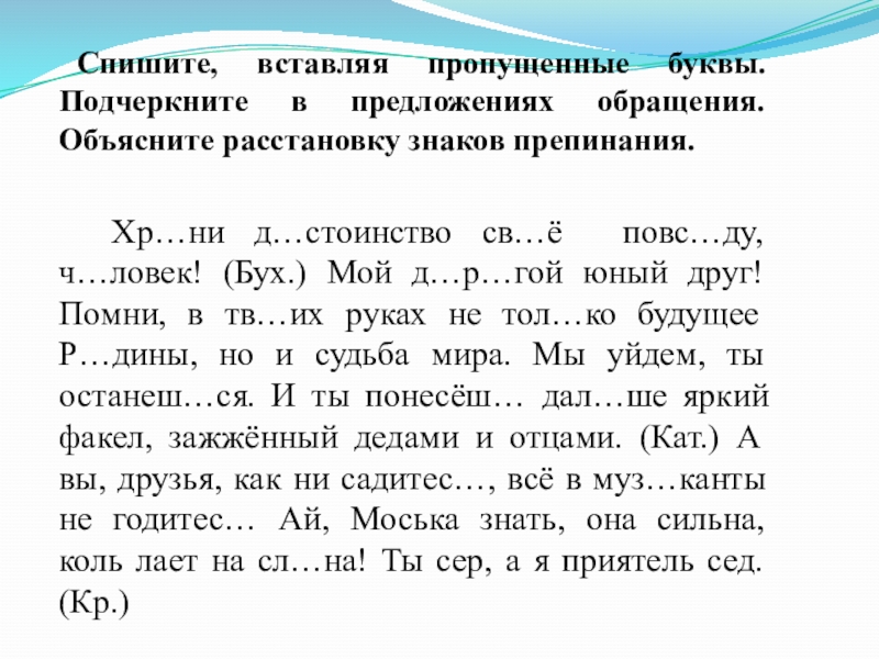 Слайд 12 Спишите, вставляя пропущенные буквы. Подчеркните в предложениях обращения. Объясните расстановку знаков