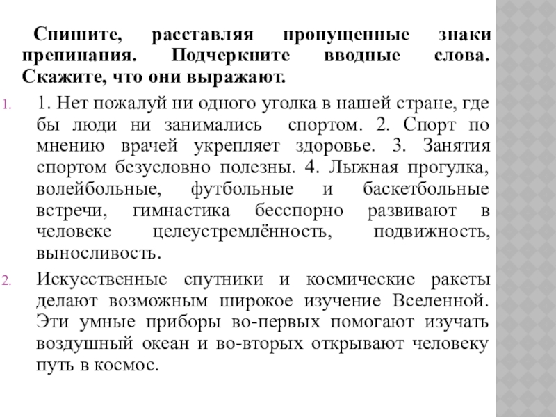 1. Нет пожалуй ни одного уголка в нашей стране, где бы люди ни занимались спортом. 2. Спорт по мнению врачей укрепляет здоровье. 3. Занятия спортом безусловно полезны. 4. Лыжная прогулка, волейбольные, футбольные и баскетбольные встречи, гимнастика бесспорно развивают в человеке целеустремлённость, подвижность, выносливость.